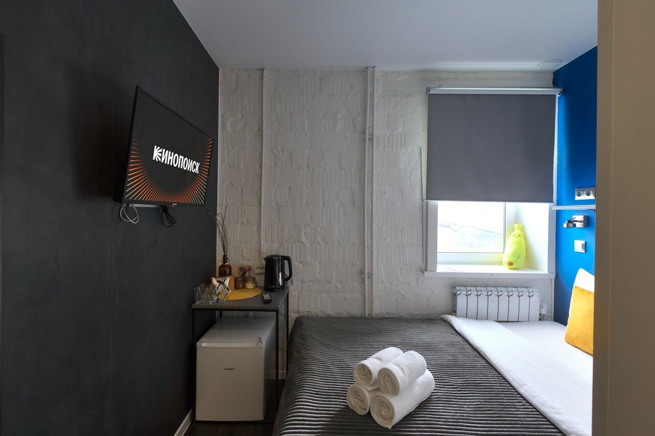 Просторный номер в спокойных тонах площадью 11 кв.м. В номере 1 двуспальная кровать. Проживание рассчитано для 1-2 человек.